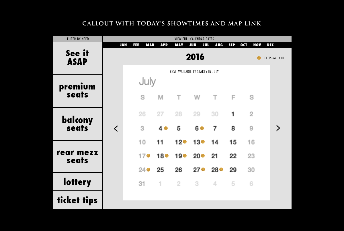 It was clear that the traditional ticket purchasing flow did not work for this show. Show goers cared less about deciding when to see the show but how soon they could. I went through many iterations and different approaches to the calendar design. While it was easier to sketch out my ideas with a pen and paper, it was easier to communicate and conduct user tests by using low fidelity mockups.